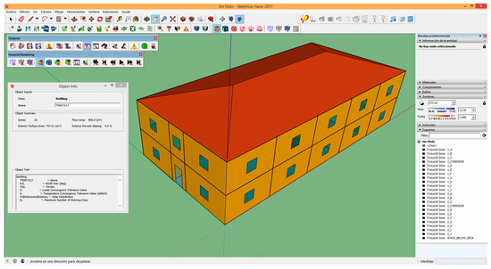In this study, a representative two-story building with a rectangular shape has been energy simulated. Several operational conditions, building’s use, and climatic data will be used for comparison. The simulations have been made by means of the Transient System Simulation package (TRNSYS v.17, Thermal Energy System Specialists, LLC, Madison, WI, USA) [29], which is an extremely flexible, graphically-based software environment used to simulate the behavior of transient systems, such as buildings. TRNSYS is made up of two parts. The first one reads and processes the input file, iteratively solves the system, determines convergence, and plots system variables. The second part is an extensive library of components, which models the performance of one part of the system.