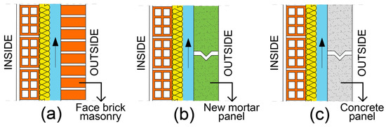 Three types of façades have been assessed with different outer covering layers: (i) face brick masonry, (ii) new mortar panel, and (iii) concrete panel. All of the façades simulated have the minimum insulation thickness in order to not exceed the limits of the Spanish Building Code [30]. Now, all of the constructive features of the façades are shown in Table 5 and Table 6 (in layers from the inside to the outside). In addition, constructive sections of the façades are shown in Figure 5.