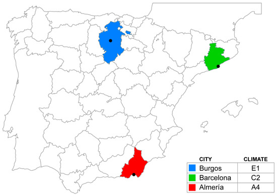 Energy simulations have been performed locating the office in three Spanish cities: Burgos, Almería, and Barcelona, which are representative of the most severe climate in Winter (E1), the most severe climate in Summer (A4), and an average climate (C2), respectively, according to Reference [30]. They are shown in Figure 6 and Table 13 and Table 14.