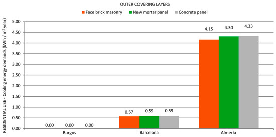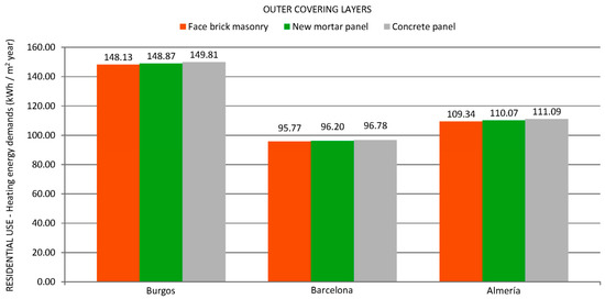 The results of the energy demands for the three cities with each of the three possible outer covering layers are shown in Figure 7, Figure 8, Figure 9 and Figure 10, for comparing the results. Figure 7 and Figure 8 correspond to the residential use, while Figure 9 and Figure 10 correspond to tertiary use. On the top of each bar of the diagrams, the exact value of each energy demand is shown, in kWh/(m2 year), in order to make both the understanding and the comparison easier.