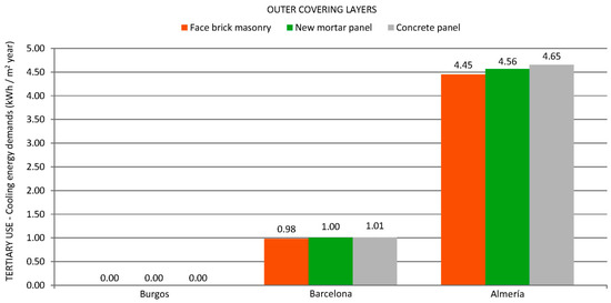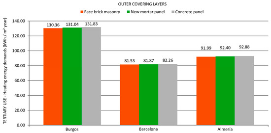 It can be observed in these figures that the maximum heating energy demand and the minimum cooling energy demand are obtained by using the concrete panel as the outer covering layer, for both residential and tertiary use, and in all of the three cities where the building is located for this study. In contrast, the minimum heating energy demand and the maximum cooling energy demand is obtained using the face brick masonry as the outer covering layer. Using the new mortar panel, intermediate energy demands are obtained for heating and for cooling.