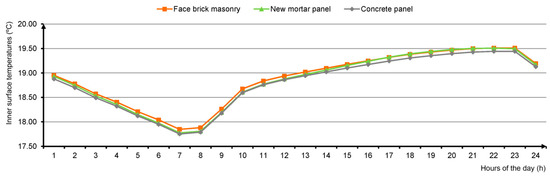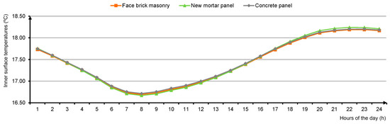 A second step of this simulation study is to evaluate the transient inner surface temperature of the different external walls. Inner wall temperature is of the utmost importance when evaluating the radiation exchanges between walls and persons due to temperature differences. Thus, it will be possible to assess the influence of using each of the three outer covering layers proposed in this temperature, which is important for the comfort of the users of the building, and also for reducing the risk of surface condensations.