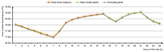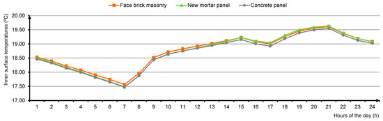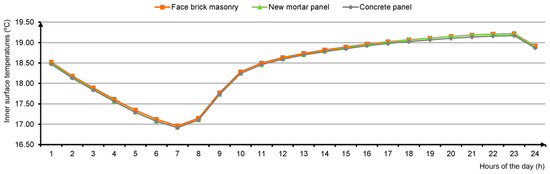 Figure 11 shows the temperature profile for the selected middle day of winter, for residential use in Almería. The minimum inner surface temperature appears at 7 h, which is just before the dawn, reflecting the decrease of ambient temperature during the night. Between 7.00 h and 8 h, there occurs a slight increase in temperature due to the incoming daylight radiation. The heating schedule starts at 8 h and then the temperature of the inner wall increases, which reaches 19.50 °C by 23 h due to the heating and internal gain schedule, following the set point of 20 °C for ambient temperature. When changing to tertiary use (Figure 12), the minimum wall temperature also appears at 7 h in the middle of the day in autumn. The difference in the temperature profile with respect to the residential use (slope, pikes) is only due to the respective heating schedule. Since ambient temperature at 7 h would be lower than the set-point of 20.0 °C, the heating starts at 14 h, and then a local peak is reached at 15 h. The temperature decreases along two hours, since the heating schedule began again at 17 h until 20 h. The maximum temperature of 19.50 °C of the inner wall is reached at 21 h due to the thermal inertia of internal gains. As shown in the figures, no significant differences can be appreciated in the temperature profiles due to the change of the outer layers (face brick masonry, new mortar panel, or concrete panel).