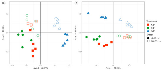 Unconstrained PCoA indicated that microbial β-diversity clearly clustered based on soil depth and cultivation system; these components explained 32.24% and 11.01% of variation in microbial β-diversity, respectively (Figure 1b). PERMANOVA revealed that soil depth (p < 0.001) and cultivation system (p = 0.047) led to significant shifts in overall microbial community composition (Table S1). Univariate analysis showed that microbial abundance (i.e., the ACE and Chao 1 indices) and diversity (i.e., the Shannon index) were significantly higher (p < 0.05) in the 0–10 cm than 10–20 cm soil layer, except for the CP plot (Table 3). At 0–10 cm, microbial richness was higher in CF and NF than CP, while microbial diversity was significantly higher in CF than CP (Table 3). However, there was no difference in microbial richness or diversity between any cultivation systems at 10–20 cm.