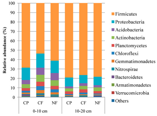 To clarify microbial community composition within the three cultivation systems, the phylum-level dataset was analyzed first; pyrosequencing generated 38 bacterial phyla and two archaea phyla across all soil samples (Figure 2). The most dominant phylum across all treatments was Firmicutes (53.56%–79.12%). The relative abundance of this phylum was more abundant in CP (68.47%) and decreased in the order of NF > CF at 0–10 cm soil depth. Furthermore, the relative abundance of Firmicutes was higher at a soil depth of 10–20 cm (76.28%–79.13%) than 0–10 cm (53.56%–68.47%).