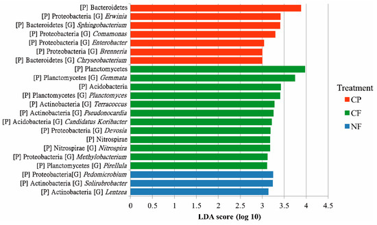 Linear discriminate analysis (LDA) of effect size (LEfSe) to identify preferential taxa at the phylum [P] and genus [G] levels in each agricultural practice at a soil depth of 0–10 cm. Only taxa with an LDA score > 3.0 are shown. No taxonomic differences were observed between the three agricultural practices at a depth of 10–20 cm. CP: conventional practice with chemicals; CF: conventional practice without agrochemicals; NF: natural farming.