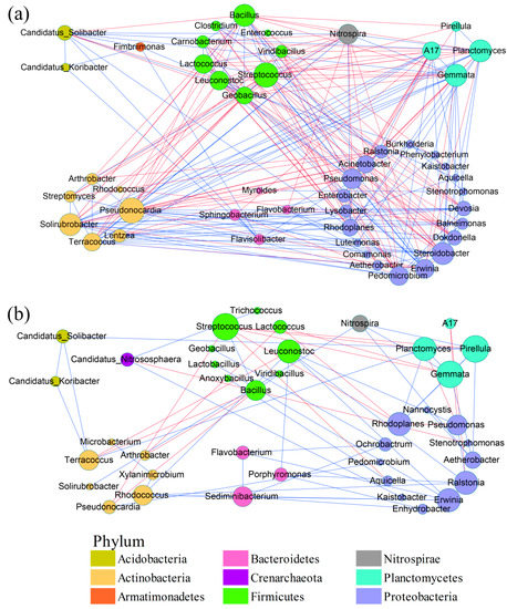 Overview of microbial network associations in response to different cultivation systems at soil depths of (a) 0–10 cm and (b) 10–20 cm. Correlations between the fifty most abundant genera in each soil layer were selected for each network. Blue and red edges represent significant, strongly positive (r > 0.6, p < 0.01) or negative (r < −0.6, p < 0.01) correlations between two nodes. The size of each node is proportional to the number of edges associated with the node.