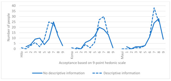 Consumer decision making is a complex process influenced by many factors. Marketing, branding, and packaging blast consumers with information about a product in order to purposely alter their consumption patterns, choices, preferences as highlighted in a quantitative meta-analysis conducted by Verlegh and Steenkamp [48]. Marketing plans are used to motivate consumers to purchase a product, these plans can include addressing store atmosphere, social media influence, corporate social responsibility, brand choice, and perceived value and sales promotion [49,50,51,52,53]. For the purpose of this study, information available to consumers about the product was targeted and it is no surprise that any information about the product to be sampled would have some impact on the consumer’s rating of the product. Dichter, however, argued that the products’ country of origin may in fact have a large impact on its acceptance [54]. This is of particular interest to this study where consumers were informed that breadfruit has been an important staple crop in the Pacific for more than 3000 years, making the point that what they are about to sample is a local crop of importance. Thus, it can be seen that the product information presented positively influenced their acceptance of the breadfruit product. Similar observations have been made by Verlegh and Steenkamp and Peterson and Jolibert confirming that when consumers are presented with information relating to the country of origin, there was in fact a measurable medium- to large- effect on consumers’ evaluations, especially on the perceived quality of the product [48,55]. Considering that 84% of the consumers who sampled the breadfruit products in this study were residents of Hawaii, it was assumed that they were more familiar with breadfruit as a tree that grows locally and perhaps the product evoked an affective role.