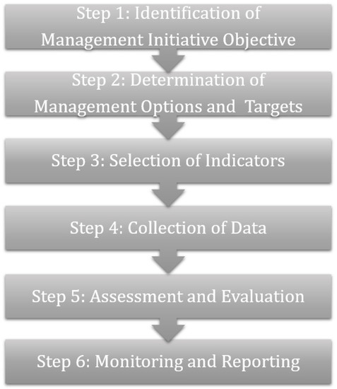 The first methodological step of the sustainability assessment is the definition of the concrete objective of the coastal or marine management measure, which is planned to be practiced, improved, or revised. The objective of the management initiative lays out the potential and the aimed direction of the same focused initiative with respect to achieving sustainability. Once the strategic management initiative objective is determined, the main targets of the different Management Options (MOs) can be subsequently established (Figure 1, Step 2). The principal goal of this step is to understand the nature of what is to be achieved and within which limits of the focused sector, area, or region it is to be achieved. If this is clearly identified at an early stage, more suitable tailor-made indicators can be selected, with more satisfactory outcomes expected from the assessment.