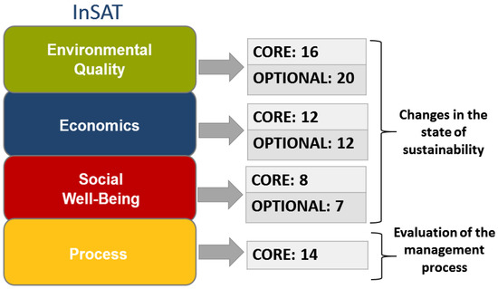 This graphic shows the InSAT sustainability categories (on the left), main objectives (on the right), and the total number of core and optional indicators included in the tool.