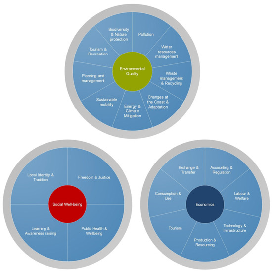 The following criteria are used for selecting indicators: (a) scope (selecting indicators that fit into the main aim and targets of the studied management initiative, with particular focus on sustainability issues) [25,26]; (b) relevance (selecting the most suitable indicators for a specific coastal or marine study subject) [25,26,27]; (c) data availability (taking into account the accessibility of data); and (d) quantification (considering the quantification capacity of an indicator as a selection parameter or reference value for making comparisons) [25]. Moreover, the selection of the indicators was carried out according to the following criteria: (a) theoretically well founded; (b) relatively stable and independent; (c) clear in content; (d) measurable and comparable, easy to quantify; (e) regionally specific; (f) based on data that is acquirable [30]. Additionally, selected indicators are used to guide decisions in managing human activities in coastal and marine areas. Therefore, they ought to be specifically orientated towards guiding the decision-making process.