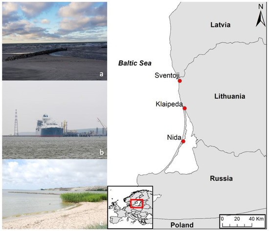 Locations of research study sites: (a) Port of Šventoji; (b) Klaipėda LNG floating storage and regasification unit; (c) Nida beach.