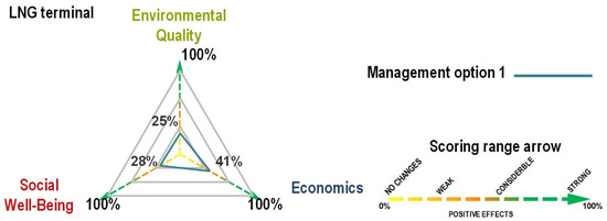 Like many other countries in Europe, Lithuania is facing challenges in the energy sector in terms of the security of energy supply, competitiveness, and the sustainability of the energy sector. One of the national tasks for sustainable economy development has been to decrease gas consumption by replacing it with renewable energy sources, while ensuring gas supply alternatives in the short term [41]. For this purpose, the construction of LNG floating storage and a regasification unit terminal was implemented in Klaipeda. LNG allows Lithuania to import natural gas from various countries around the world and as such has an effect on the Lithuania economy. The assessment results of the case study on the LNG terminal showed weak positive effects on environmental quality (25%) and social well-being (28%) and showed considerable positive effects on the economic category (41%) (Figure 5). CS 1 strongly contributes to the economic sub-categories: accounting & regulation, labour & welfare, technology & infrastructure, and exchange & transfer.