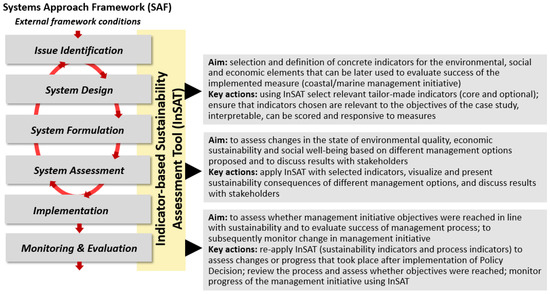 An effective sustainable resource management has to be rooted in system thinking [17,18]. The Systems Approach Framework (SAF) for the integrated assessment of coastal systems has been developed as a holistic approach to revitalize ICZM and to overcome its existing weaknesses. The SAF helps to organize the best available scientific knowledge for it to be mobilized in supporting deliberative decision-making processes [17,19]. The SAF has been tested in a wide range of case studies [20,21,22,23]. It turned out to be a suitable stepwise, guiding approach to systematically address and solve problems in coastal systems and to improve the implementation of measures [19]. However, to support the SAF process and to enable practitioners to carry it out successfully, supporting tools and methods are still needed. Indicators that allow for the post-evaluation of the success of a management process, as well as a comprehensive assessment of its final result in close cooperation with stakeholders, are important requirements [19].
