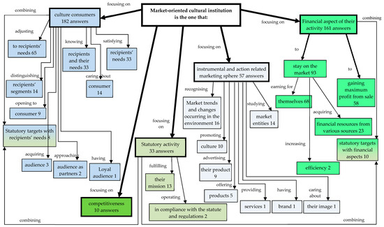 Aiming at recognizing how the notion of market orientation in the cultural sector is understood by decision-makers in cultural institutions, a semantic network was created. Semantic networks, which consist of bundles and links, allowed the identification of mental representations and processes [31] in terms of how decision-makers in cultural institutions perceive the category of market orientation. Analyzing the managing staff’s answers to the open-ended questions asked in the quantitative study concerning distinguishing features of market-oriented cultural institutions, the individual answers in relation to the mechanisms of the formation of meanings that are reflections of cognitive processes and methods of conceptualization of notions were analyzed. The question was: “Please finish the following sentence: A market-oriented cultural institution is one that… “. Analyzing the semantic area, the keywords were identified and then were categorized according to the functions they performed in respondents’ statements, when simultaneously considering the notions characterizing the studied issue, associations, and equivalents that could replace the keywords. The process aimed at an accurate reproduction of the respondents’ intentions. The analysis of the semantic area that emerged from the phrases allowed the identification of the thoughts about market-oriented cultural institution. The analyzed semantic field depicts the image of a market-oriented cultural institution as viewed in the minds of decision-makers’ in cultural institutions as one focused on culture recipients, the financial aspect of their activity, the instrumental and action-related sphere of marketing, statutory activity, and increase in competitiveness. The ways in which decision-makers in cultural institutions in Poland understand the notion of market-oriented cultural institution are presented in Figure 2 and the whole semantic network is shown in Figure 3.