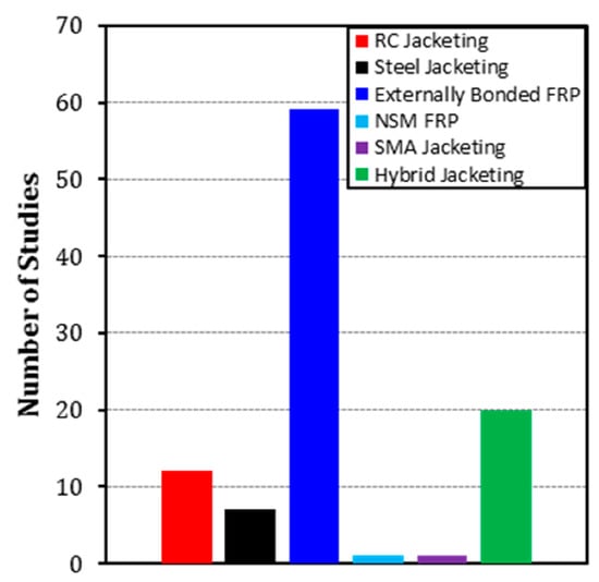 The strengthening and repair techniques for RC columns presented in this paper have been broadly categorized into six types, reinforced concrete/mortar jacketing; steel jacketing; externally bonded fiber-reinforced polymer jacketing; near-surface mounted fiber-reinforced polymer jacketing; shape memory alloy (SMA) jacketing; and hybrid jacketing. This state-of-the-art review included 99 studies that have been conducted on the strengthening of RC columns in the last two decades. Of these studies, externally bonded FRP strengthening has been the most popular method in literature, with approximately 59 studies, as shown in Figure 1.