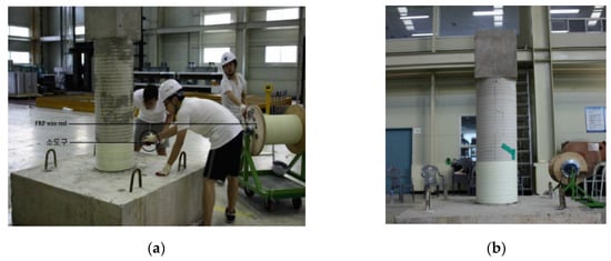 Recently, Choi et al. [] reported the effectiveness of strengthening with tensioned GFRP winding wires in improving the seismic performance of RC columns with and without lap splices. The study consisted of two columns with lap splices and two with continuous longitudinal reinforcement. One column of each of the two categories was strengthened with tensioned GFRP wires as shown in Figure 6. The results of the experimental testing showed that GFRP wire winding increased the flexural strength and failure drift of the strengthened columns of both categories compared with the control specimens. Moreover, it was observed that GFRP wire winding prevents buckling of the longitudinal reinforcement, vertical splitting of the lap splices and concrete spalling. Seo et al. [] also proposed another quick and easy-to-install method comprising a GFRP strip device which is composed of a strip of GFRP composite with a aluminium clip connector and proposed to attach it in the plastic hinge region of the column. The experimental results showed a significant improvement in the seismic performance of the strengthened columns in terms of strength, displacement ductility and energy dissipation capacity. Moreover, the failure mode of the column was changed from a brittle shear to a ductile flexural mode.