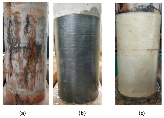 (a) Corrosion damaged; (b) CFRP repaired; (c) PET FRP repaired [91-Elsevier Copyrights].