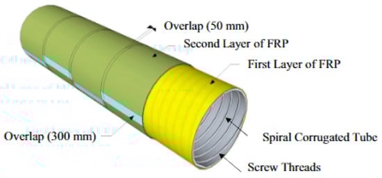 FRP jacketing is one of the most popular seismic retrofitting methods all over the world, primarily because of the many advantages FRP composites have to offer over traditional strengthening methods (RC and steel jacketing), such as ease and speed of installation, less labor work, minimum change to the original geometry and aesthetics of the structure, high strength-to-weight ratio, and, most importantly, its occupant-friendly nature. However, it has certain disadvantages as well, such as, the effective utilization of externally bonded FRP is just 30–35%, due to premature debonding []. Moreover, FRP is relatively costly and shows poor properties when exposed to high temperatures or wet environment. FRP is generally bonded externally to the column using epoxy resins. Different types of FRP composites have been utilized by different researchers for strengthening purposes, the details of which are provided below.