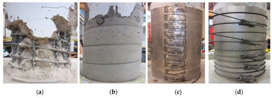 The polyethylene terephthalate FRP composites are made from recyclable materials and have the advantages of high deformability and economy over CFRP composites. Moreover, they possess greater tensile capacity than conventional FRPs. The study by Dai et al. [] presented the results of PET FRP jacketed specimens and compared the results with a high-strength aramid FRP jacketed specimen. The results of the experimental study demonstrated that PET FRP is a viable alternative to conventional FRPs as it enhances the displacement ductility of RC columns significantly and also does not rupture at the ultimate limit state. More recently, Liu and Li [] strengthened partially corroded RC columns with CFRP and polyethylene terephthalate (PET) FRP composites, respectively, as shown in Figure 7 and performed a comparative assessment of the relative performance of the two strengthening systems. The results of the experimental study evaluated in terms of energy dissipation, damping ratio, hysteretic performance and stiffness degradation indicated that strengthening using CFRP and PET FRP composites resulted in a nearly similar improvement in the seismic performance of the RC columns.