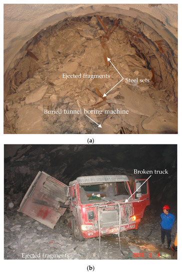 Examples of rockbursts in tunnels of the Jinping II hydropower station, China. (a) Extremely intense rockburst on 28 November 2009 in drainage tunnel that caused seven deaths and one injury and total destruction of a tunnel boring machine. (b) Extremely intense rockburst on 4 February 2010 in headrace tunnel #2 that created three fissures in the floor. A truck was severely damaged and its windshield was shattered. Three workers in the truck were injured by the violent shakes [20].