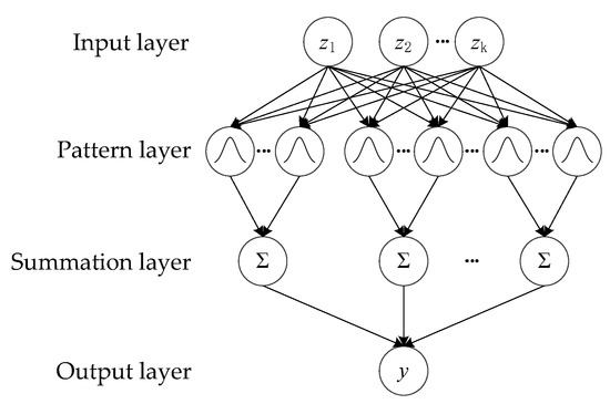 In Figure 2, the first layer is the input layer. The input vector is X = (z1, z2, …, zk), k is the number of neurons, and zk is the kth neuron. The second layer is the pattern layer. The output from the second layer is given by
