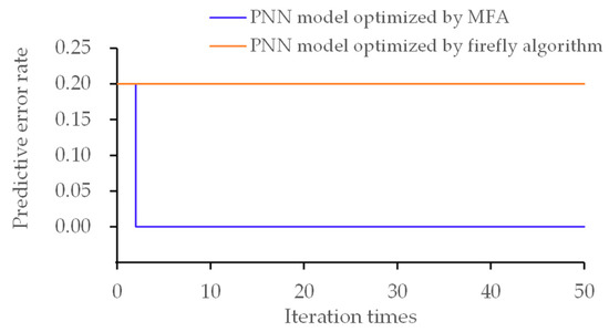 From Figure 4, we find that when the firefly algorithm is used to optimize the smoothing factor in the PNN, it falls into a local optimum. The error rate in rockburst prediction in test samples stayed at the locally optimal result of 0.2. However, by using the MFA, it reached a global optimum at the third iteration. This shows that convergence speed and global search ability are improved by the MFA. By using the MFA, the smoothing factor in the PNN is optimized, with a value of 0.0143.