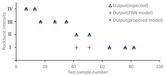 Results of rockburst prediction of the 10 test samples based on the MS monitoring information and the MIVA-MFA-PNN model are shown in Table 5. In Table 5, the expected output is the actual intensity of the rockburst and the actual output is the prediction result. The rockburst intensity predicted by the MIVA-MFA-PNN model is exactly the same as the actual results in the study sample. All 10 cases of test samples are predicted correctly. The error rate of rockburst prediction based on real-time MS monitoring information and the MIVA-MFA-PNN model is zero.