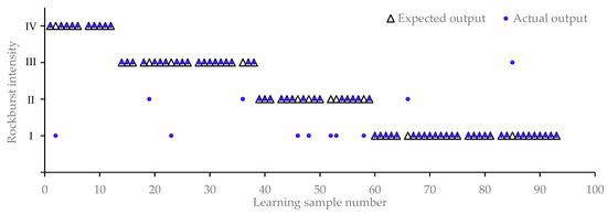 The results of rockburst prediction of the learning samples based on the MIVA-MFA-PNN model are shown in Figure 6. There are 11 rockburst cases with incorrect predictions (correct prediction rate of 86.75%). The learning samples with incorrect predictions are summarized in Table 6. The reasons for the few incorrect predictions are as follows; (1) in some samples, there is a large dispersion of MS parameter values. For example, microseismicity of rockburst case 2 greatly differs from the statistical characteristics of rockbursts of that intensity. (2) In order to ensure good generalizability, the neural network tries to avoid overfitting. In this case, the best generalization error is achieved by sacrificing the training error. (3) The number of samples is not large enough. In this case, the characteristics of the rockburst cannot be learned very well by the MIVA-MFA-PNN model.