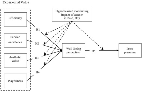 The purpose of this study was to investigate customers’ sense of well-being perception and whether they are willing to pay a price premium for a cruise’s experiential value. In previous research, the study of the relationship between experiential value, customer perception, and behavior in the hospitality industry is mostly focused on hotels [13,14] and restaurants [15,16]. Only limited studies on the hospitality industry exist. In particular, few studies have been conducted on the topic of luxury cruises. Thus, we established hypotheses regarding the relationship between the experiential value of the luxury cruise and the outcome variables based on a thorough literature review. We also established a hypothesis for the gender-specific moderating roles in relationships between the variables. To analyze the proposed theoretical relationship, a conceptual model was created and an empirical analysis was conducted using empirical data collected from 273 luxury cruise passengers. The analysis results provide key theoretical/practical implications.