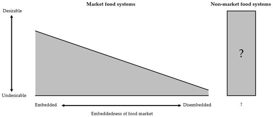 The call for regulated or embedded food markets misses grander opportunities for a more desirable world. Food is rarely traded in markets at all in contemporary and historical societies whose markets are embedded—that is, societies that do not subordinate social life and institutions to the market [,,]. Internal (within-community) food markets arise when land and labor become commodities []. If, following Gerber and Gerber [], ecological economics founds itself partly on freeing life from full determination by markets, we might do well to focus on freeing food—an essential, ecological, cultural good with unique characteristics that undermine many of the benefits of markets []. Think of food like health care. Economists have long struggled to reconcile market theory with the fact that general equilibrium cannot be reached if participants’ survival is not guaranteed by some initial endowment []. A Nobel prize-winning economist, unable to find a satisfactory specification that did not assume death by starvation for those whose resources were insufficient, once conceded that the market model “would be found best suited for describing a society of self-sufficient farmers who do a little trading on the side” []—or any society whose nourishment is assured by non-market food systems, I would add. In addition to alternative markets, food activists and scientists should consider alternatives to markets.