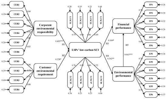 Then the structural equation model (SEM) was estimated using the maximum likelihood estimation method in AMOS 22.0. The overall fits of the SEM were χ2 = 655.859, df = 388, χ2/df = 1.690 < 3, CFI = 0.911, IFI = 0.912, TLI = 0.900, RMSEA = 0.075 < 0.08, indicating good overall fit. As shown in Figure 2, the SEM results indicate that corporate environmental responsibility (β = 0.493, p < 0.001) and customer environmental requirement (β = 0.228, p < 0.05) have positive relationships with LSPs’ low-carbon SCI, thereby supporting H1 and H2, respectively. Further, LSPs’ low-carbon SCI had a positive effect on LSPs’ environmental performance (β = 0.302, p < 0.01) as well as financial performance (β = 0.169, p < 0.05), thereby supporting H3 and H4, respectively. In addition, it was found that the LSPs’ environmental performance had a positive relationship with financial performance (β = 0.661, p < 0.001), thereby supporting H5.
