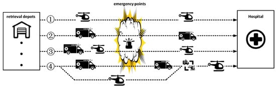 Some studies [8,35,36,37] propose an emergency location programming model of multiple transport modes under a medical rescue background for an air-ground collaborative transport mode. Specifically, Erdemir et al. [8] and Bozorgi-Amiri et al. [37] present a programming model for the integrated locating of helicopter stations and helipads by considering uncertainty in demand points, and establish three transfer modes—(1) direct transfer by an ambulance, (2) transfer by an ambulance to a helicopter station and then to a hospital by a helicopter, and (3) transfer by an ambulance to a predetermined point and then to a hospital by a helicopter.