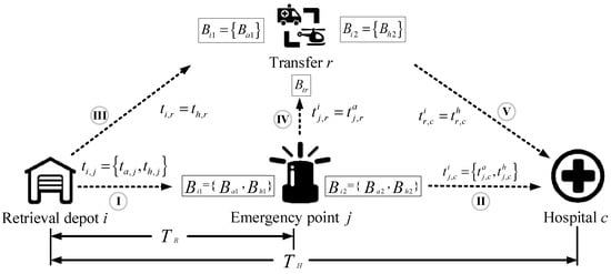 - Transshipment scheduling—Route I is selected from the retrieval depot to the emergency point and the attribute of the retrieval depot is a; Route III is selected from the retrieval depot to the transshipment point and the attribute of the retrieval depot is h; Route IV is selected from the emergency point to the transshipment point and the attribute of the retrieval depot is a; and, Route V is selected from the transshipment point to the hospital and the attribute of the retrieval depot is h.