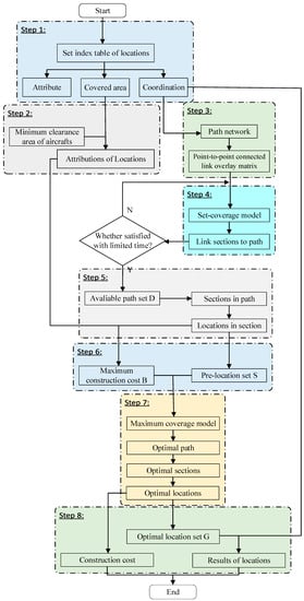 Step 8: Determine the optimal location set G and the final construction cost. With either the optimal covering matrix or the scheduling matrix, ranks with a value of 1 are involved in various types of optimal path (i.e., the connection section of the optimal set point), and then combine information index of Step 1 and generate the optimal site set G, which is a subset of S. The final construction cost according to the facility construction costs is obtained for the target area.