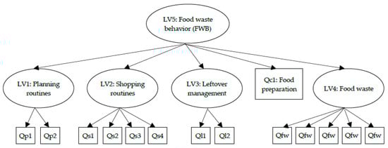 Hypothesized measurement model of food waste behavior. Ovals represent latent variables (LV) and rectangles represent indicators (Q) or single questions described in Table 2.