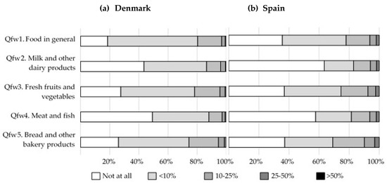 Figure 3 illustrates the amount of food and food sub-categories reported to have been wasted in a regular week for each country separately. Approximately 20% respondents in Denmark and 22% in Spain indicated throwing away more than 10% of food in a regular week, whereas 80% in Denmark and 78% in Spain reported not throwing away any food or less than 10% of food in a regular week. When looking at the specific food sub-categories, more than 10% of bread and other bakery products were reported to be thrown away by about one-third of respondents in both countries, with fresh fruits and vegetables the second most susceptible food sub-category reported to be thrown away in a regular week in both countries. In Denmark, meat was the least susceptible food sub-category reported to be thrown away in a regular week, while in Spain, milk and other dairy products was the least susceptible sub-category.