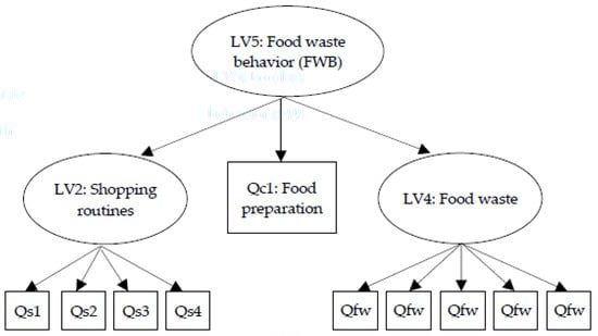 Final measurement model of food waste behavior. Ovals represent latent variables (LV) and rectangles represent indicators (Q) or single questions described in Table 3.