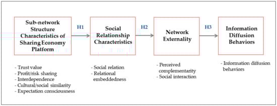 Thus, the network of a sharing economy platform refers to the social connection of the sharing economy, which is created voluntarily based on preference. Its members actively communicate information about a shared product category or an activity, as well as new information. Here, a strong connection among users, who are connected through the network’s structural characteristics, has an influence on the spread of shared information. Social relationships on sharing economy platforms are becoming increasingly horizontal, primarily because of the multi-communication features of interactive network information in mobile social networking services [9]. This new type of collaborative consumption based on the sharing economy is contributing to greater economic efficiency owing to the Internet and mobile computing technologies. These social characteristics are important in the social environment of human interactions and their influence [10]; notably, social connectivity in the sharing economy also enhances trust and commitment in a relationship.