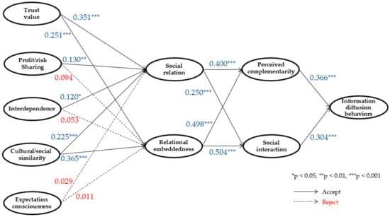Fourth, the effects of social relations and relational embeddedness on social interaction can be interpreted in line with research indicating that social interaction is a social capital of a relational dimension that is crucial for social similarity, shared value, and cooperative/personal interaction [50]. Possibly, social interaction in SNS will increase user interaction and the individual’s social connection can be broadened [44]. Furthermore, participants’ behaviors in a certain network reflect the interactions with the utility, consciousness, and behavior of other participants in the same network [78], and social behaviors play a significant role when structured in a social network [40].