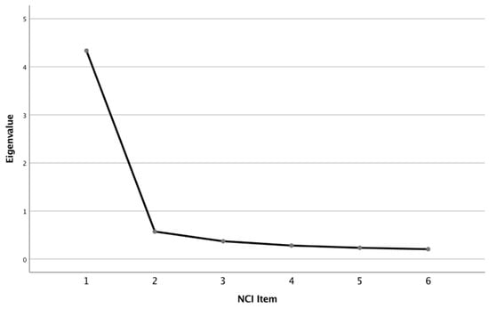 Owing to both the overlapping time periods to which the data were collected as well as the conceptually different group demographics reported here (i.e., adults vs. children), we opted to report three separate Exploratory Factor Analyses (EFA) instead of conducting a follow-up confirmatory factor analysis (CFA) on a further, more-comparable sample. This approach of multiple EFAs rather than CFA is supported by work elsewhere [55]. An EFA on the 6 items of the NCI was conducted on the MENE adult cohort (n = 3568) using Principal Component Analysis (PCA) and varimax rotation. Bartlett’s test of sphericity was significant (p < 0.001), indicating that factor analysis was possible, and the Kaiser-Meyer-Olkin measure (KMO) was sufficiently high (0.913), indicating sampling adequacy. The results suggested extraction of a single factor (see Figure 3), which accounted for 72.26% of the variance. Each of the 6 items had a loading threshold of more than 0.50, and together, had high internal consistency (α = 0.92). The single factor was labelled Nature Connectedness.