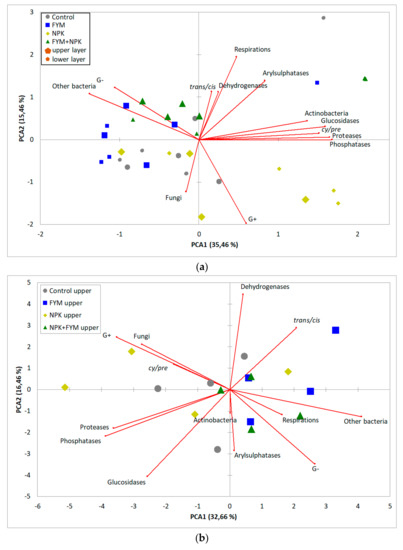 Overall the detected differences were very low and insignificant in direct single-factor comparison. We therefore decided to calculate the principal component analysis (PCA) to help understanding the data variability. The Spearman correlation matrix was used for its robustness to outliers. For better interpretation of results, the Varimax rotation of PCA was applied to produce the final graphs. In our previous studies, this approach contributed to understanding of differences of microbial communities, e.g., on different localities [37], such as in sandstone caves affected by tourist traffic [31], or in post-military sites during phytomanagement [34]. Considering both soil layers together (Figure 1a), two principal components together explain only 51% of the data variability; together with PC3, the explained variability is 64%. Other PCs are below 10% of variability explanation. This comparison just confirms the fertility of used cambisol, serving as a highly competitive environment for microorganisms. PC1 is highly correlated with activities of hydrolases (glucosidases, proteases, and phosphatases, but not arylsulphatases) as well as actinobacterial PLFA and cy/pre indicator. In undisturbed soils, this indicator is usually interpreted to exhibit lack of growth based on nutrient limitations [39,43]. Also, the increased activities of hydrolases are considered to show the microbial effort to gain nutrients under their limitation [26]. Therefore, variability of nutrients can be considered as one possible driver of the microbial variability. PC2 correlates fairly positively with activities of dehydrogenases, arylsulphatases, trans/cis indicator, and respiration; and negatively with proportion of PLFAG+ and PLFAfun. Explanation of variability on this axis can thus be related to variability of environmental conditions. Individual samples are widespread across the PCA chart, thus confirming high natural variability of the data and low effect of the fertilization. Nevertheless, NPK samples that slightly tend to cumulate in fourth quadrant correlated more with PC1 (nutrient insufficiency) and negatively with PCA2 (lower microbial activity). This indicates that from the point of view of soil microorganisms, the NPK presents worse fertilizer compared to the other two tested.