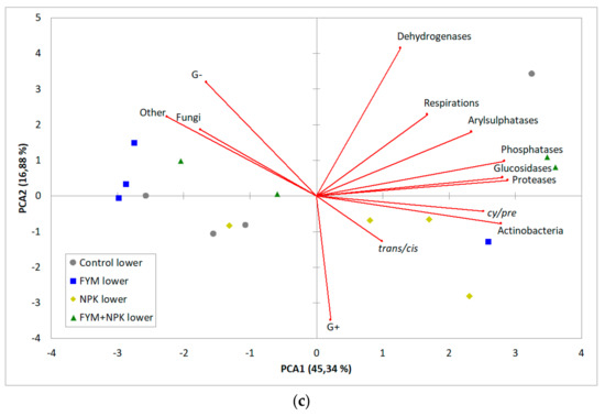The upper layer explained variability is similar (Figure 1b), i.e., 49% for two PC and 64% for three PC. Nevertheless, the two main PC have exchanged, i.e., the nutrient-related x-axis explains less variability. In case of the lower soil layer (Figure 1c) overall variability is higher, i.e., two PC explain 62% and three contribute to 73%. This is consistent with the expectations that fertilization will affect the upper soil layer more compared to the lower soil layer.