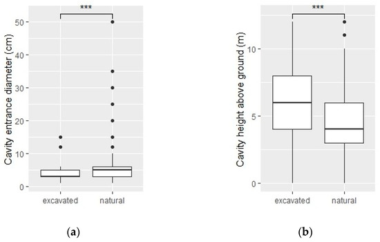 Box plots comparing excavated to naturally-occurring tree cavities in terms of their (a) entrance diameter and their (b) height above ground using the Wilcoxon test. In both comparisons, p < 0.001, as indicated by the asterisks. The box shows the interquartile range of the data (25th–75th percentile), with the line in the middle indicating the median. The “whiskers” (lines) extend to points within 1.5 times the interquartile range while the dots show outliers. Sample sizes = 77 (excavated cavities) and 207 (natural cavities). This figure was made using the R packages “ggsignif” [41] and “ggplot2” [42].