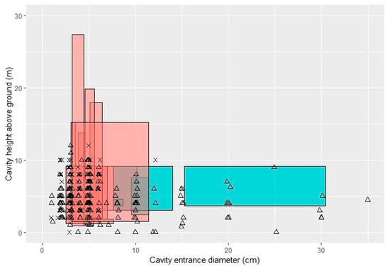 Observed cavities in the context of their suitability to locally breeding cavity-nesting birds. Each polygon represents cavity requirements (or in some cases, recommendations) for a different cavity-nesting species in our region. Diurnal species are in pink and nocturnal species are in blue. Cavity polygon parameters for each species are from the literature [2,33,34,35] and are listed in Table A1 in Appendix A. Observed excavated (X’s) and naturally-occurring (triangles) cavities, recorded as part of the current study, are plotted over these polygons. One 50 cm diameter cavity (2 m above ground) was removed from the plot to improve image clarity. Data points have been “jittered” in order to show multiple cavities with the same dimensions. This figure was made with the R package “ggplot2” [42].