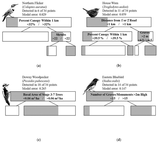 Classification trees for four of the cavity-nesting species: (a) northern flicker; (b) house wren; (c) downy woodpecker; and (d) eastern bluebird. The shaded area in each top bar represents the proportion of points in which the species was detected (out of 34 total). At each subsequent level, the data are split according to the variable and level shown in the bar above, and the shaded area in the bars show the proportion of sites within those parameters in which each species was detected.