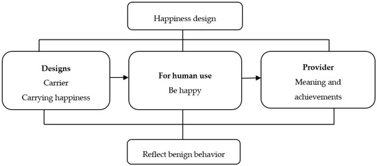 The global population aging problem is becoming more and more serious, and various countries are gradually moving towards a super-aged society; 13 countries will reach the standard of a super-aged society by 2020 and 34 countries will reach the standard by 2030 [1]. In view of people’s increasing awareness of health and the aging population, the market demand for organic and health care products is increasing rapidly. In recent years, people have paid more and more attention to active and positive psychology. At the same time, various disciplines and fields have paid more attention to the research on happiness. In the design field, packaging is considered to be the performance space that can show “happiness design” [2]; packaging can convey the information of commodities and affect consumers’ feelings towards the products. In addition to helping people have the positive effects of calmness, inspiration, and revelation by combining material happiness with spiritual happiness, packaging can make people’s brain waves show a gradually activated state when the packaging design initiates the tactile, auditory, and olfactory senses to stimulate appreciation [3,4]. The most important items in design include shape and color, as well as the inner levels of how people will feel, meaning the design object of a happiness design is the carrier [5]. It is a resource that allows people to immerse themselves in experiencing happiness and a process for people to receive happiness, and it is used to realize the life goals pursued by people and make life more meaningful, as seen in Figure 1. Thus, compared with the external factors that affect psychological happiness, psychological health is the internal factor that affects happiness the most from the personal level [6,7].