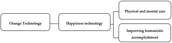 Orange Technology is a kind of technology that emphasizes people-centered and humanity-centered design, and its purpose is to practice the basic values of humanistic technology and develop industries related to happiness, health, humanistic quality, and physical and mental care. Orange is a combination of yellow and red, and these symbolic colors represent happiness and warmth, and health [9,10]. The Orange Technology industry includes three major categories: health technology, care technology, and happiness technology. Among them, happiness technology is the research focus of this study, which includes the industrial requirements of improving human quality and care for the body and mind (Figure 2). Happiness is an “abstract concept”, like joy, pain, culture, and belief, and people have different understandings of “happiness” from different angles. A product’s happiness level is divided into four major elements: cognitive happiness, perceived happiness, physiological happiness, and sensory happiness [7]. In the happiness design, the positive influences on human beings are taken as the motivation, and the factors of happiness design are discussed, as follows: favorable to human needs, life expectation, meaningful and valuable, satisfactory evaluation of emotion and life, makes people have positive effect and supportive feelings, can be tasted and enjoyed, is not a temporary pleasure, interacts with people, can obtain a sense of accomplishment, design has meaning, connotation, and affiliation, enlightens, is an experience, inspires people to be good and have the same experience as others, is activating, tasteful, and reminds people to do something, enables people to achieve their goals, and is thoughtful, satisfying, and ethical [11,12].