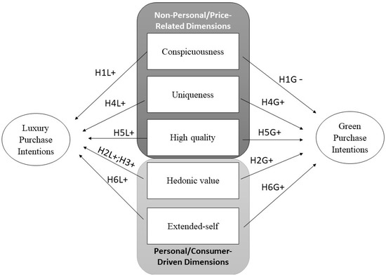 Noticeably, examining the common and contradictory motivations of luxury and green purchase intentions has been the focus of previous research. Uncovering these motivations will support luxury companies’ efforts to fit sustainability into their marketing-communication strategies [18]. Several authors [1,2,3,4,5,6,7,8,9,10,11,12,13,14,15,16,17,18,19] state that interpersonal dimensions or price-related values, such as conspicuousness, need of uniqueness, and high quality, as well as perception-related values (the extended self and hedonic values) are fundamental in luxury marketing. Furthermore, these values have significant influence on green product purchasing [7,8,9,10,11,12,13,14,15,16,17,18,19,20]. In scholarly research, to our best knowledge, the differences in the influence of personal and interpersonal values in regard to purchase intentions of luxury and green products have not been examined. Based on related research, we assume that conspicuousness and hedonism set luxury apart from environmental sustainability, whereas high quality, uniqueness, and the extended self are common components of both. Based on these assumptions, this study tackles three research questions.