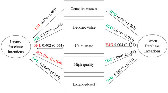 Furthermore, contrary to the predictions, uniqueness had no significant positive effect on green automobile buying intentions (t = 0.121, p = 0.904). Additionally, there was no impact on luxury automobile buying intentions (t = 0.064, p = 0.951), and the difference between the effects was insignificant. Therefore, H4G and H4L were not supported. Perceived quality positively influenced green automobile buying intentions (t = 2.352, p = 0.019). Furthermore, quality did not have a significant positive impact on luxury purchasing (t = 1.500, p = 0.134). Thus, H5G was supported, but H5L was not. Moreover, a significant and positive effect was observed of the perceived extended-self construct on green automobile buying intentions (t = 5.317, p < 0.001). Thus, H6G was supported. The extended self positively influences luxury automobile buying, thereby supporting H6L. Moreover, age had a negative effect on both (t = 5.675, p < 0.001 for the green automobile and t = 6.199, p < 0.001 for the luxury ones), thus supporting the use of a sample of younger adults.